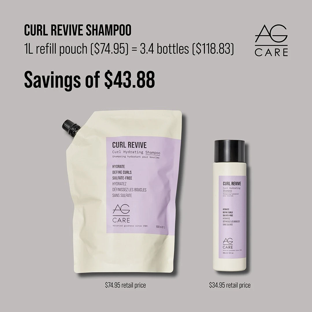 AG Care Curl Revive Curl Hydrating Shampoo 1L gently cleanses while moisturising and activating curls with coconut oil, pea peptides and our exclusive Curl Creating Complex containing rice amino acids and tomato extract. Refill pouch.Â