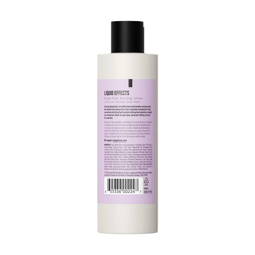 AG Care Liquid Effects Extra-Firm Styling Lotion 237ml provides long-lasting hold, incredible shine and humidity resistance. This alcohol-free styling lotion is specially formulated for thick, coarse hair and infused with protein to bring back elasticity, strength and, natural curl.