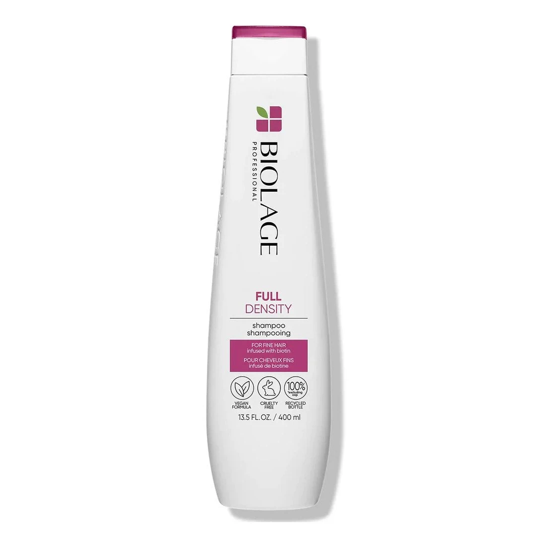 Biolage Full Density Shampoo 400ml is infused with biotin and gently cleanses thinning hair to remove impurities while building hair resiliency from root to tip. This creamy formula cleanses while adding softness and smoothness with no weight.