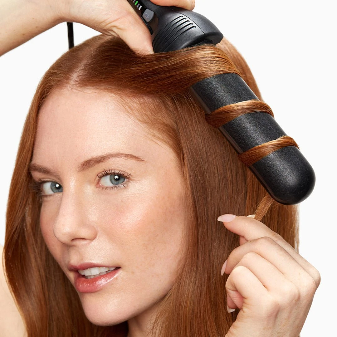 Create a section at the hairline at the back of the head. Select your temperature range from 130-180°C. Wrap hair around the wand away from the face. Repeat. Lightly comb through waves to soften. Set with finishing spray.Â