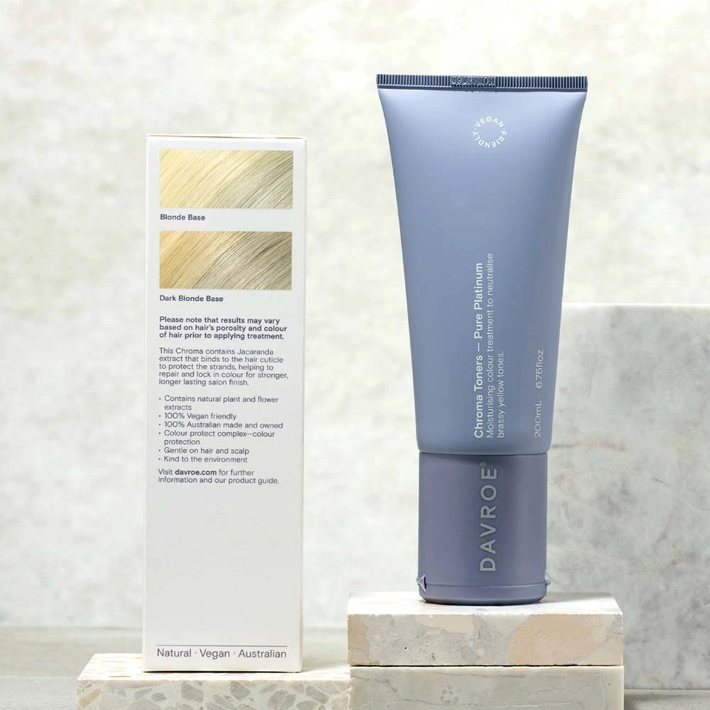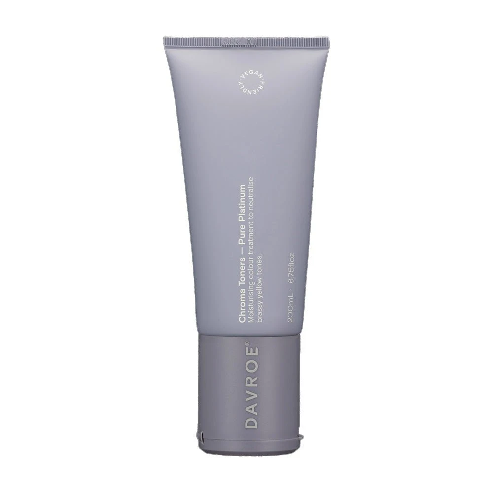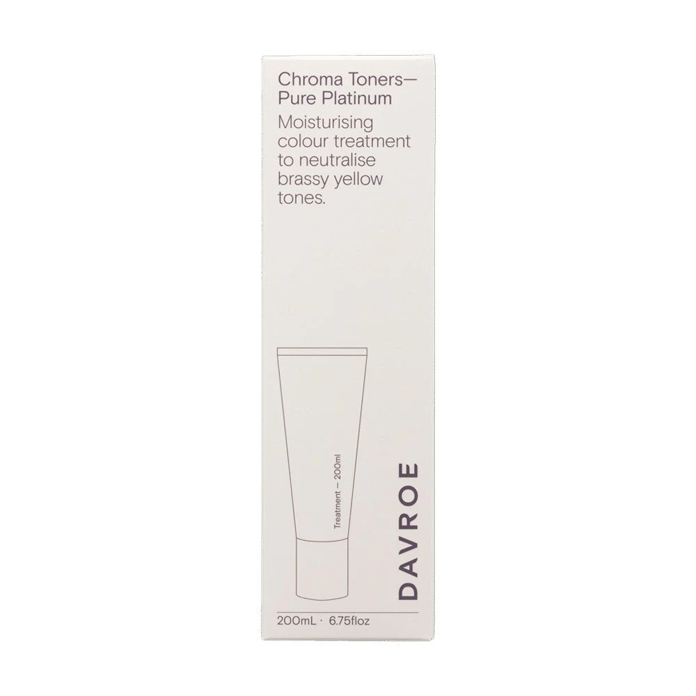 Davroe Chroma Pure Platinum 200ml will eliminate strong yellow, gold and brassy tones from blonde hair. Containing concentrated blue-purple pigments, Pure Platinum tones blonde hair to create cool, platinum/ silver reflects on pre-lightened blonde hair. Improves hair strength, while adding moisture, leaving hair nourished and revitalised.Â