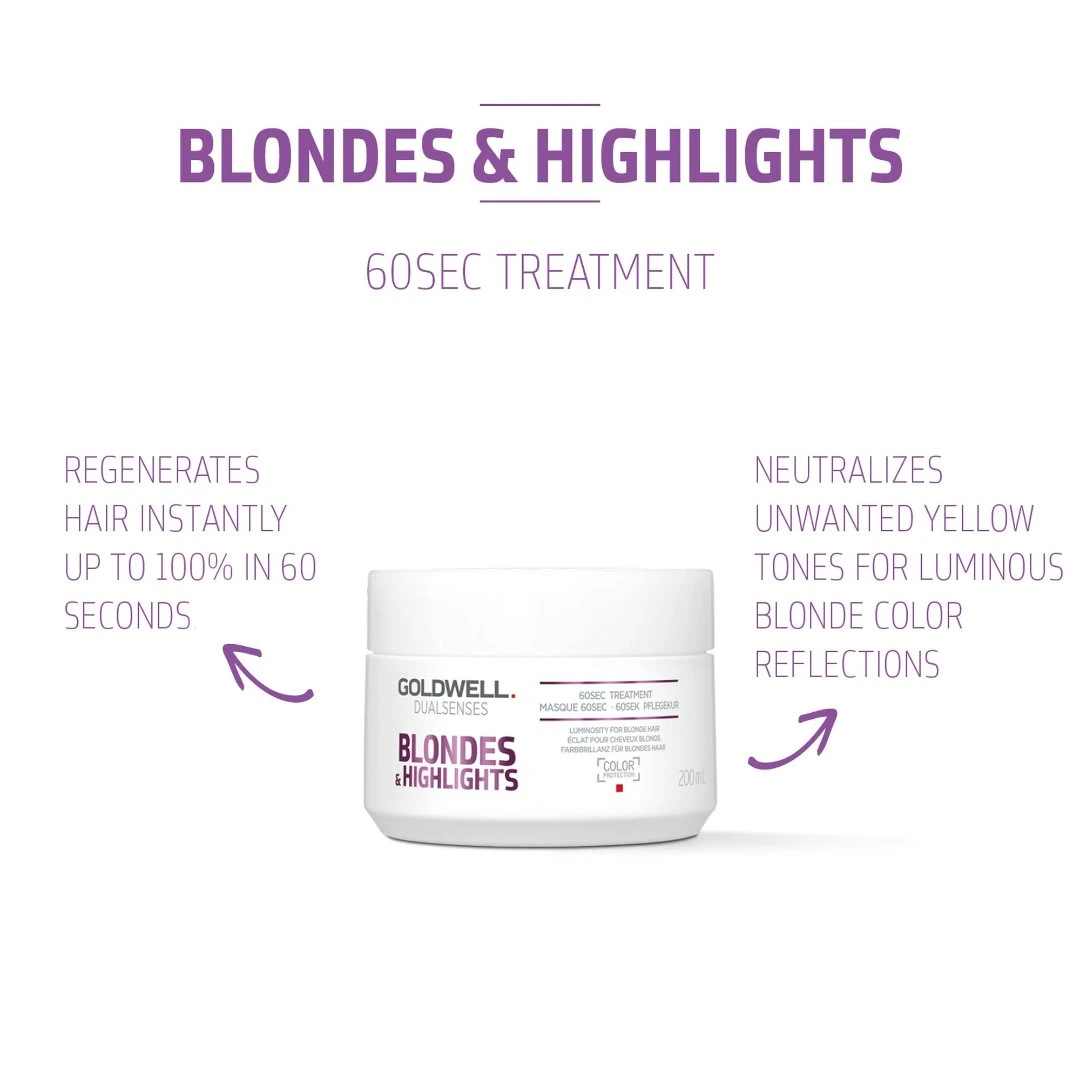Goldwell Dualsenses Blondes & Highlights 60 Second Treatment regenerates hair instantly up to 100% in 60 seconds. This in-shower treatment neutralises unwanted yellow tones for luminous blonde colour reflections.