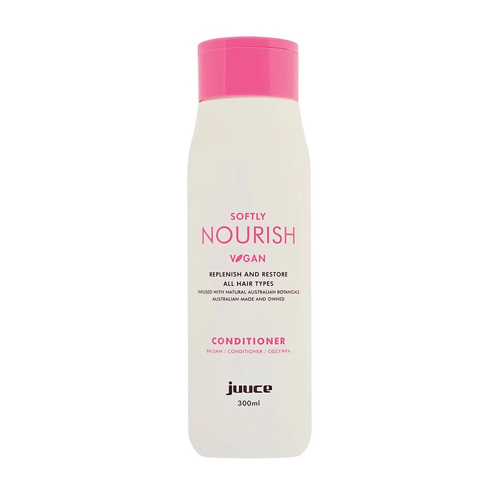 Juuce Softly Nourish Conditioner 300ml gently soothes, softens, nourishes, and helps maintain hair color for all hair types. Natural Australian botanicals and Argan Oil from Morocco combine to leave hair looking and feeling shiny and soft.