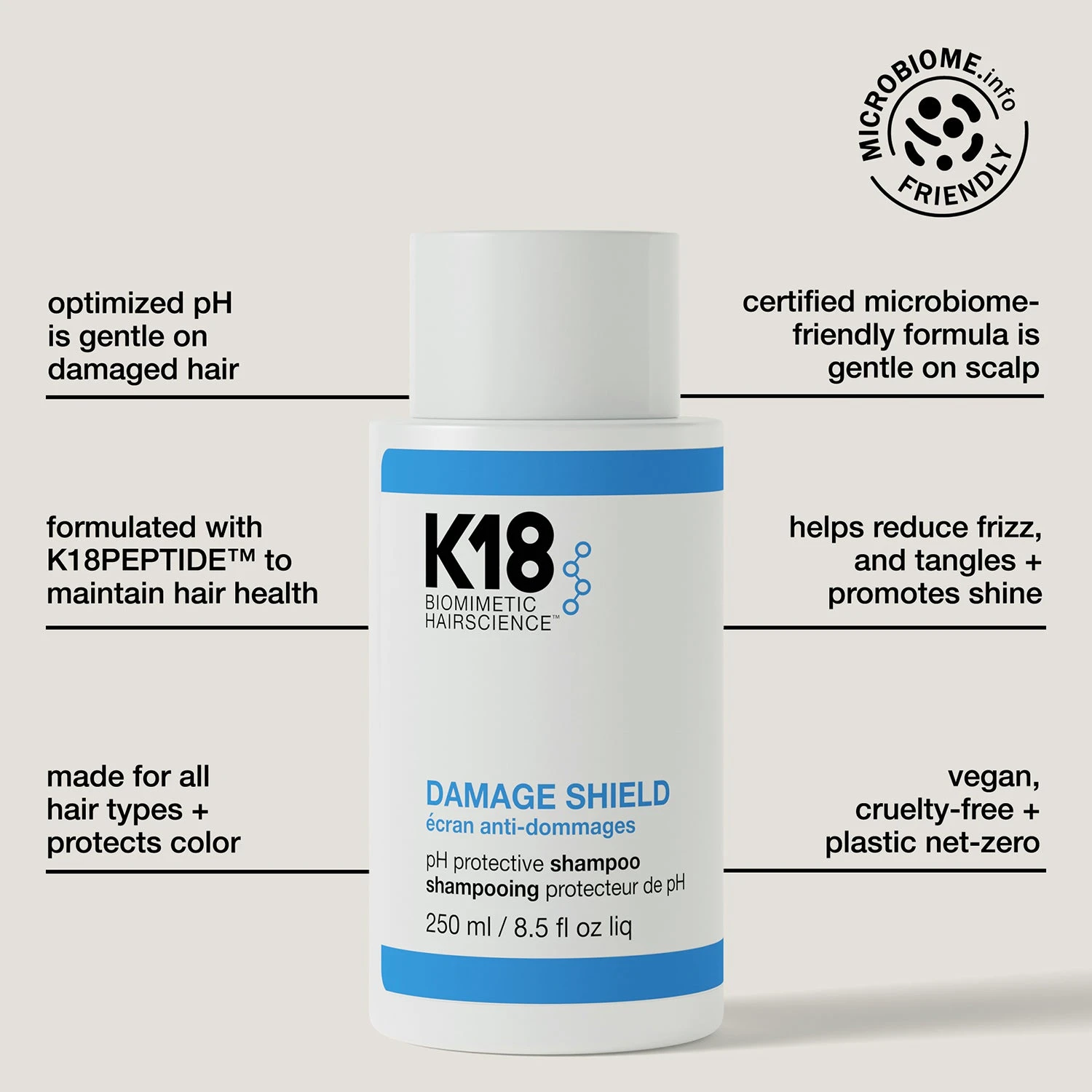 K18 Damage Shield pH Protective Shampoo 250ml maintains hair health & strength. A color-safe, pH-optimized shampoo with the patented K18PEPTIDEâ„¢ to effectively cleanse while maintaining hair health and protecting hair from damage.