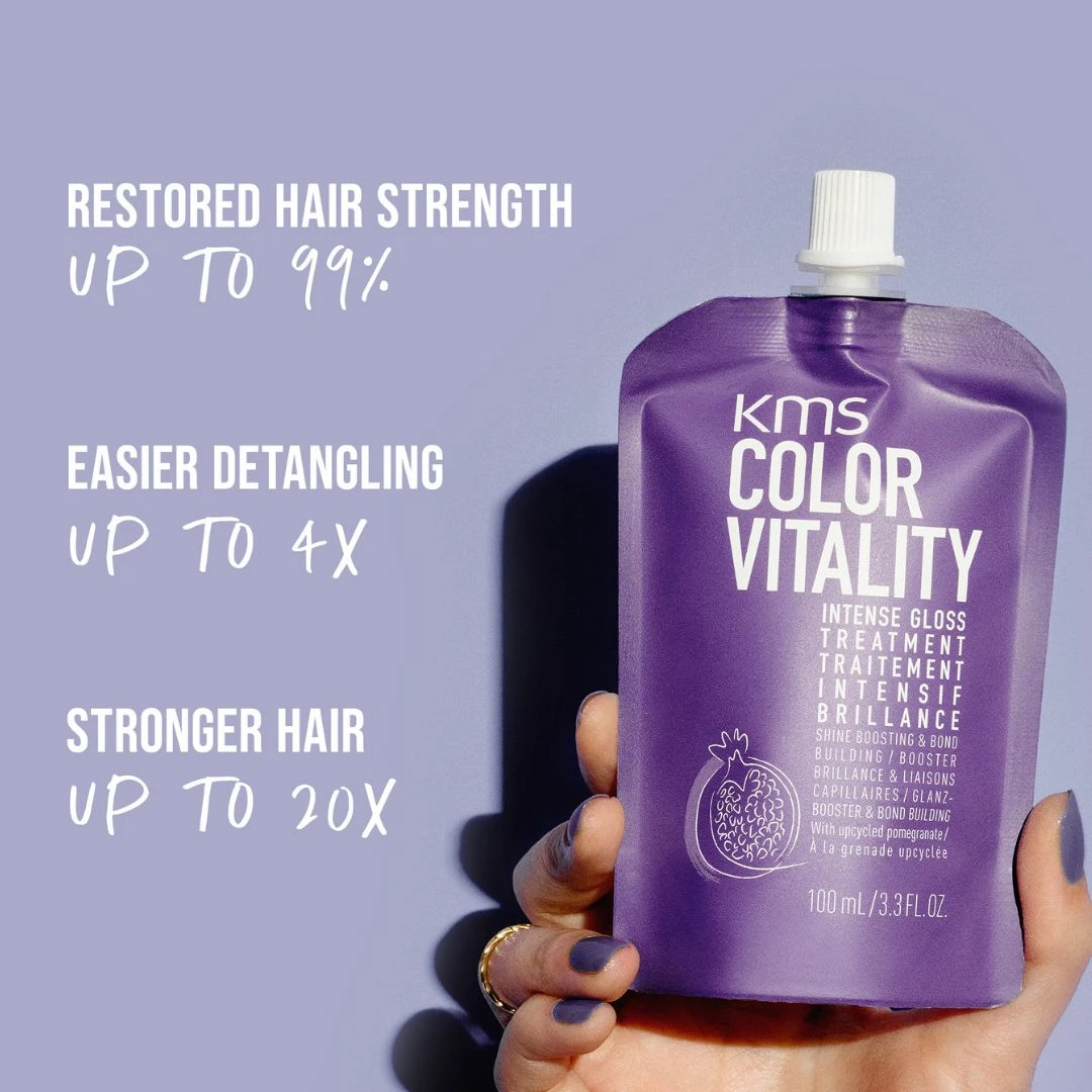 KMS Color Vitality Intensive Gloss Treatment 100ml helps restore the hairs strength by up to 99%. Bond-building* formula, restores the protein structure responsible for hair´s resilience. *Ionic & hydrogen bonds. 20 times stronger hair & 4x easier detangling.