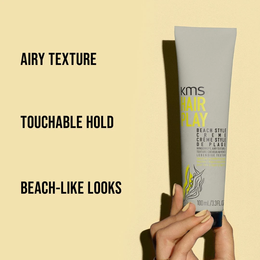 KMS Hairplay Beach Style Creme 100ml provides weightless hydration, airy texture & touchable hold for tousled beach-like looks. For all hair types & textures, straight to coily. Formulated with upcycled seaweed for clean beaches to help protect the environment.