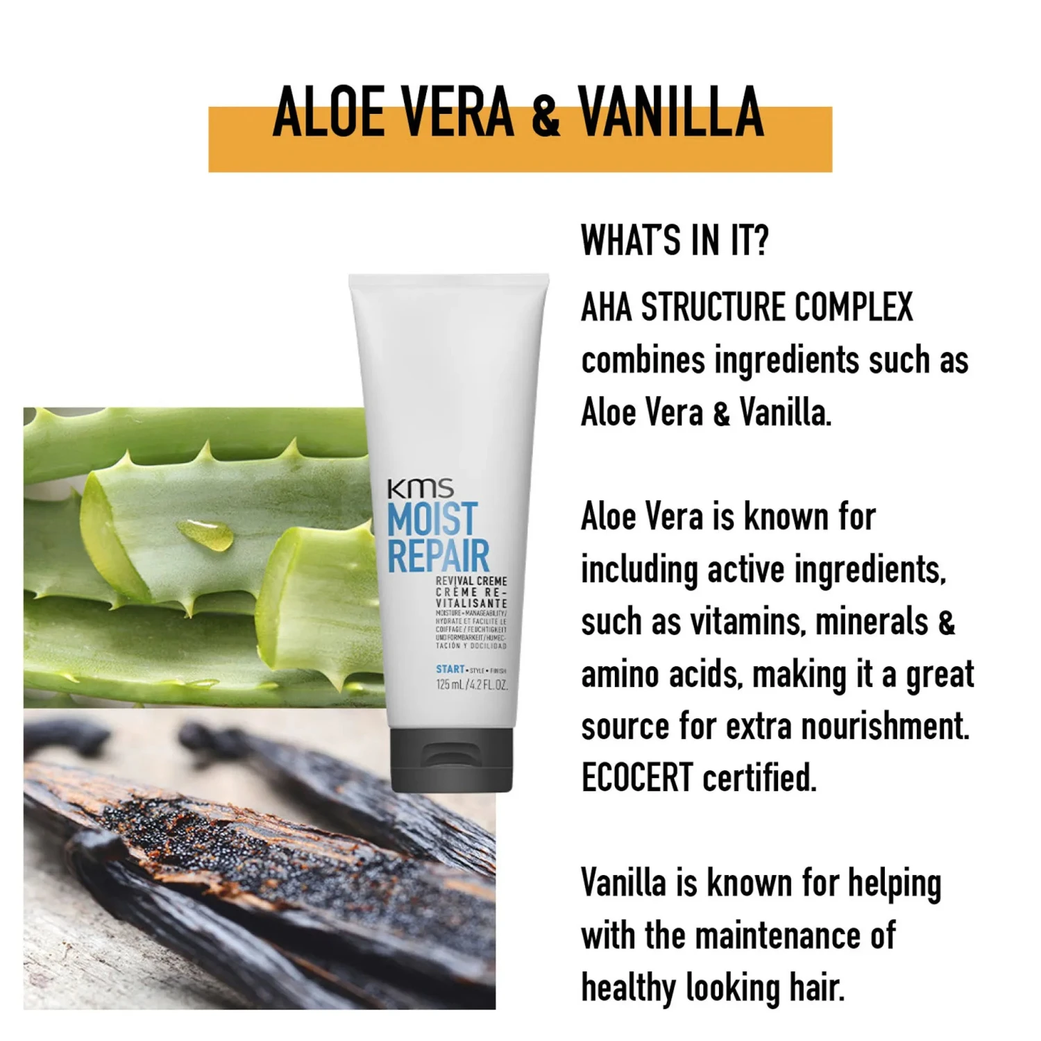 KMS Moist Repair Revival Creme 125ml reconstructs damaged hair structures, strengthens & protects from damage. Reduces breakage & split ends by up to 99%. Restores hair’s natural protective power and instantly replenishes moisture without weight.