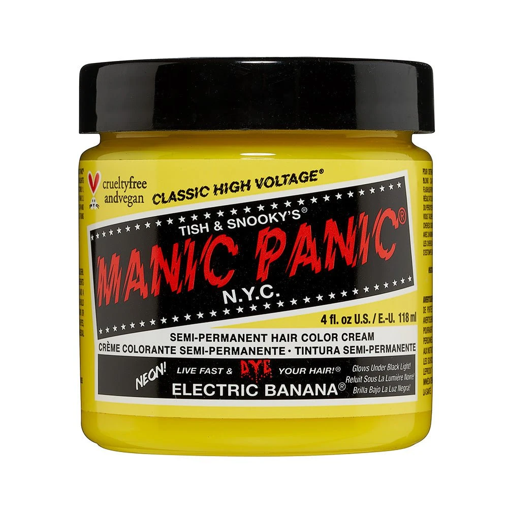 Manic Panic Classic Electric Banana 118ml is a yellow classic semi-permanent hair dye. This yellow is not just for sunny days, it’s much darker. For the most out-of-this-world results, lighten your hair to the lightest level 10 blonde before use.