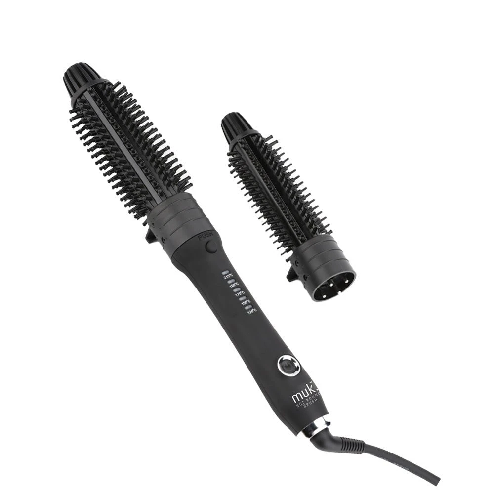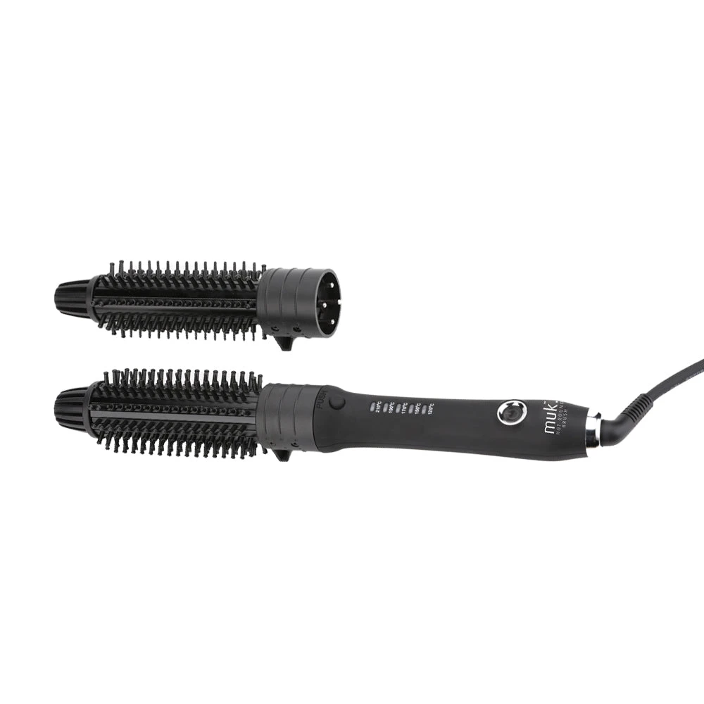 muk Hot Round Brush is an instant styler for quick on the run looks. Available with 2 interchangeable round brushes, create volume, bend, waves and curls quickly and with ease. Ceramic and tourmaline coated barrel and bristles create smooth, static free shine. Effortless styling and versatility is achieved with a 25mm and 32mm brush attachment and 5 temperature settings for varying hair types.