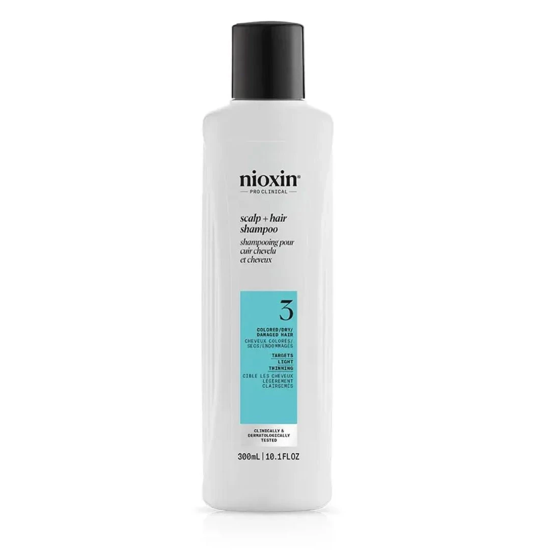Nioxin Scalp & Hair System 3 Shampoo 300ml is designed for dry, damaged, coloured hair with light thinning. Â Clinically and dermatologically tested, this shampoo nourishes and gently cleanses your hair to prevent against follicle-clogging sebum, resulting in thicker, fuller hair.Â