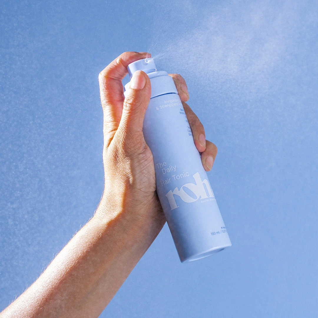ROH Daily Hair Tonic 150ml formulated to clarify, exfoliate & rejuvenate. Energise your scalp and hair with our revitalising tonic. Designed to fortify and refresh your scalp microbiome, it’s all about hydrating, untangling, and providing a daily dose of weightless nutrients and protective elements that reinforce hair strength and nurtures its natural growth cycle.