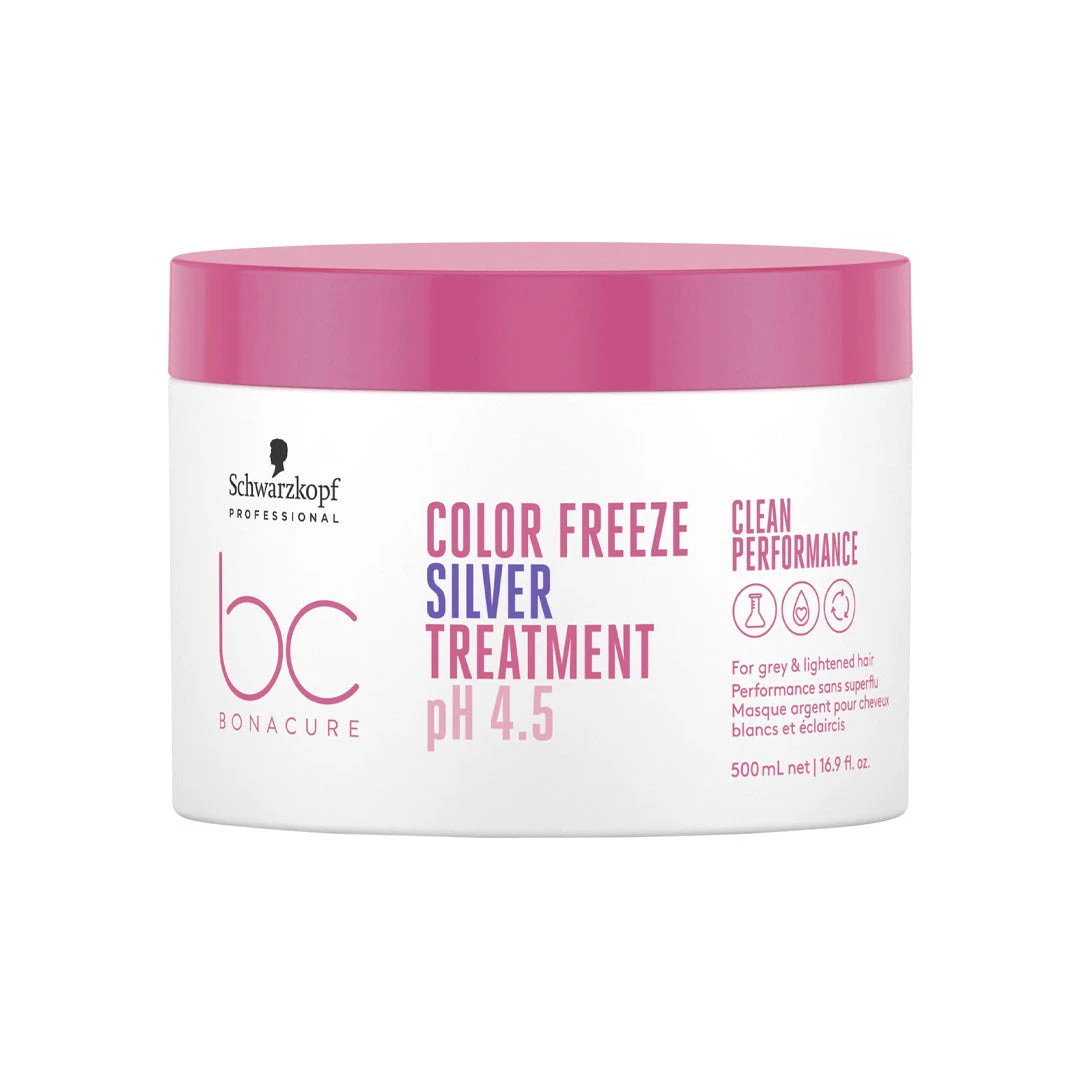 Schwarzkopf BC Clean Performance PH 4.5 Color Freeze Silver Treatment 500ml is specially formulated for grey and lightened hair. With no silicones or artificial colourants, hair is intensively nourished whilst warm undertones are neutralised. Hair is restored to its optimal pH level to perfectly freeze colour pigments inside the hair matrix, preventing fading for long-lasting hair colour.