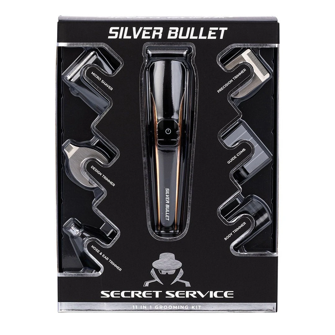 Silver Bullet Secret Service 11 in 1 Grooming Trimmer Kit includes 11 attachments and clipper guards for maximum multipurpose. This is all-in-one premium grooming. Six, easy-to-fit heads for advanced styling (full-size trimmer, precision trimmer, design trimmer, nose and ear trimmer, body trimmer and micro shaver). Four comb attachments and an adjustable attachment for precision trimmer head. Built-in rechargeable lithium battery with USB rapid charging system – charge anywhere, anytime! Finished off with a sleek yet robust design.