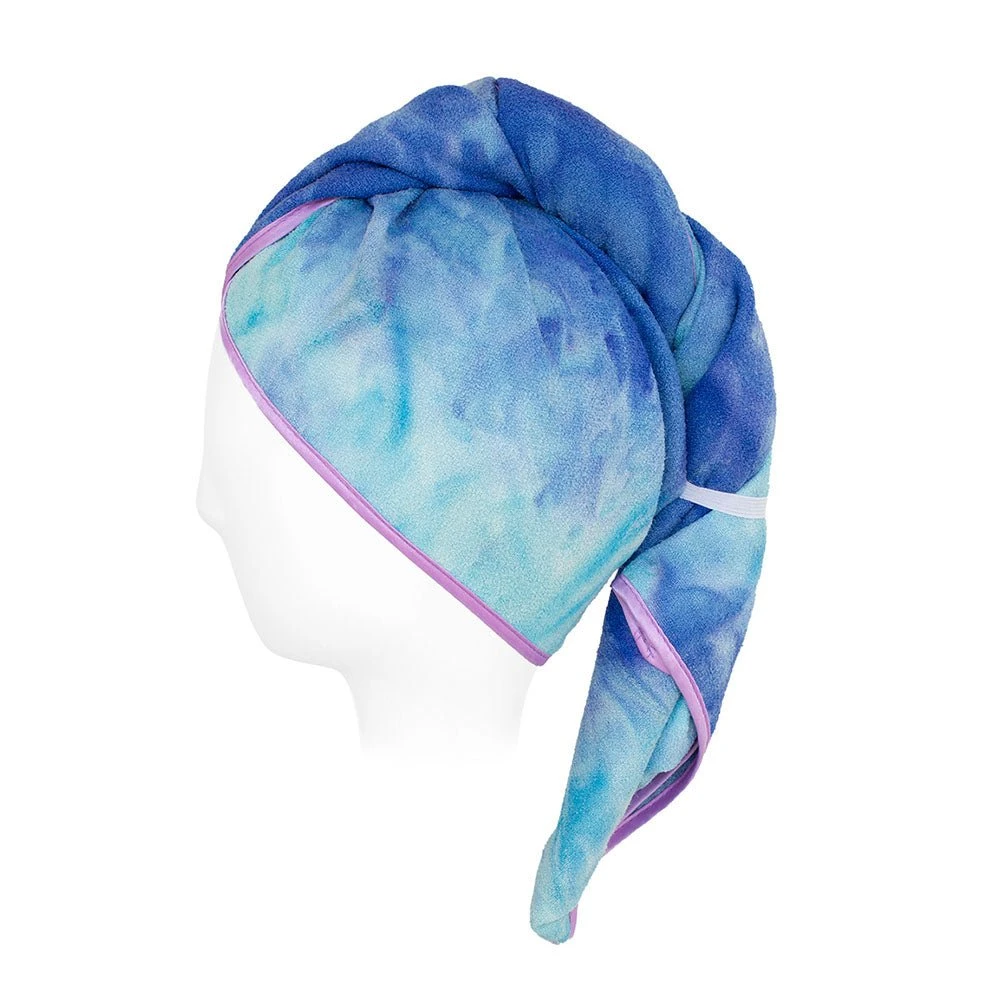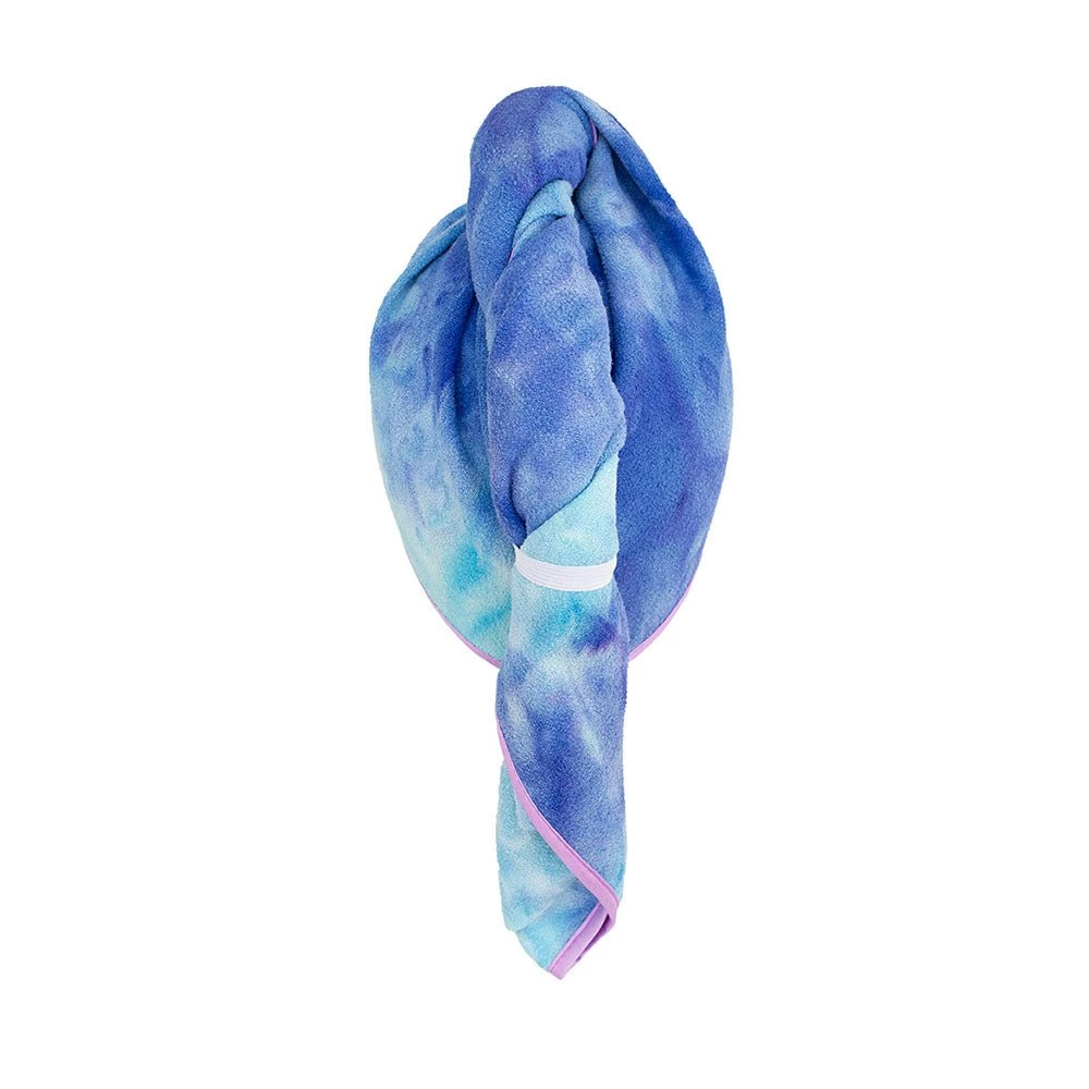 Ugly Swan Unicorn Microfibre Hair Towel Tie Dye Blue provides gentle fast drying of wet hair, curved back moulds to your head. Our hair towels dry hair faster than cotton. No friction damage. Holds seven times its weight in water and stays securely on your head with its large elastic loop. One size fits all.