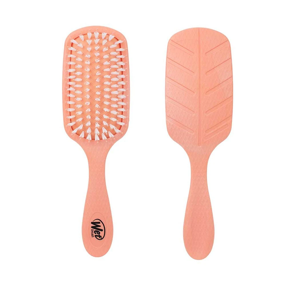 Wet Brush Go Green Shine Brush Coconut Oil infused with watermelon seed oil. The brush moisturises hair for up to 6000 strokes. The watermelon seed oil infused cushion delivers intense hydration and antioxidants, helping hair stay moisturised and more resistant to breakage.